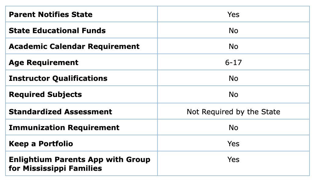 Enlightium Academy has an app and a desktop platform for families of currently enrolled students. Within this app is a group just for families living in Mississippi to inform and support each other in fulfilling your state’s requirements. Your family will be provided a link to download the app after enrolling.