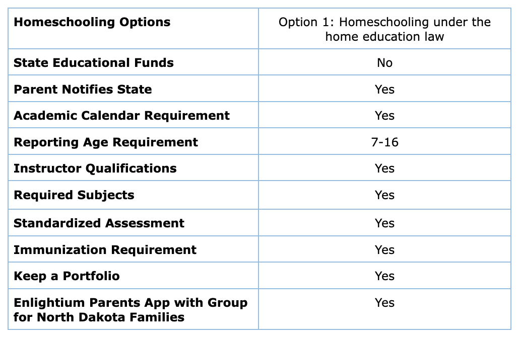 There are two options in North Dakota. North Dakota families enrolled at Enlightium Academy generally choose Option 1: Homeschooling under the home education law. The guidelines below are based on option 1.